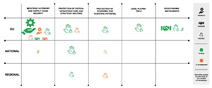 The visual representation is a cross-tab where the rows indicate the policy level and the columns indicate the categories of the Belgian National Security Strategy. The symbols identify the promote, protect or partner categories from the EU's Economic Security Strategy. Instruments in green are already in force, whereas those in orange are still under development.